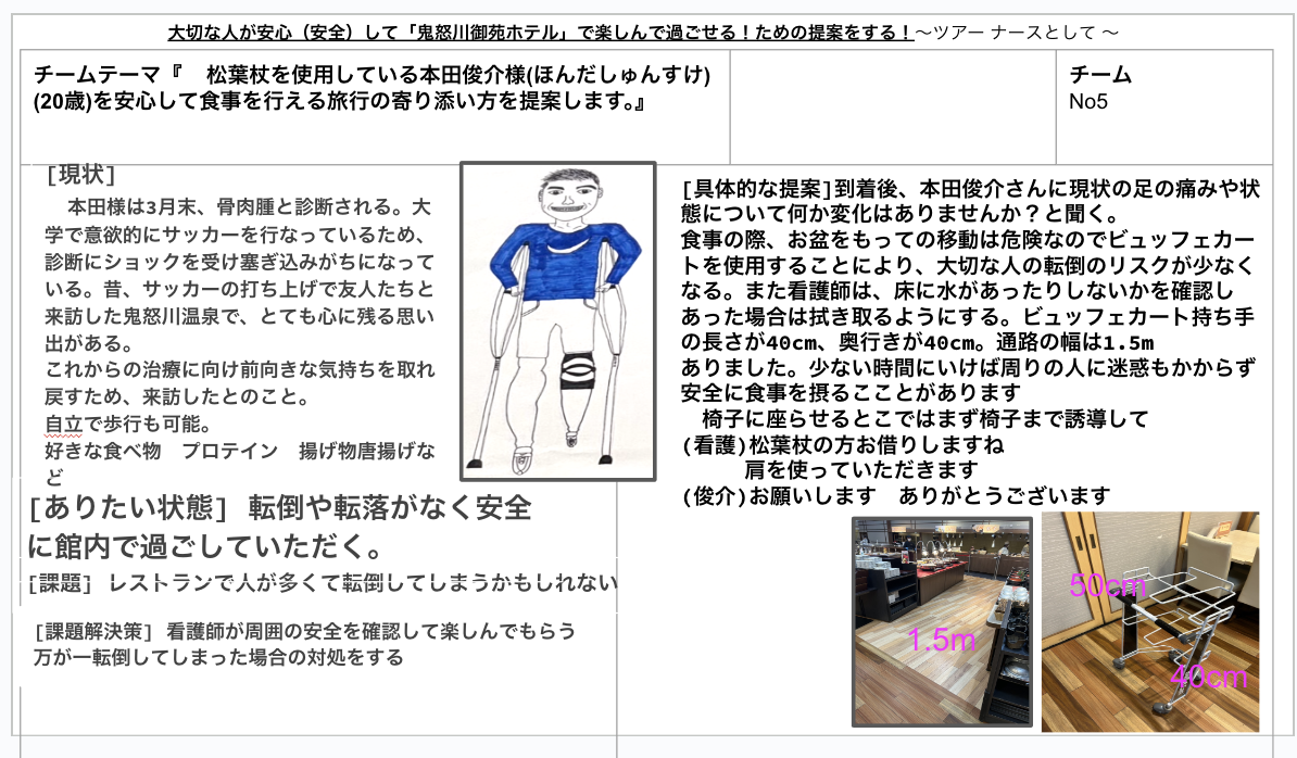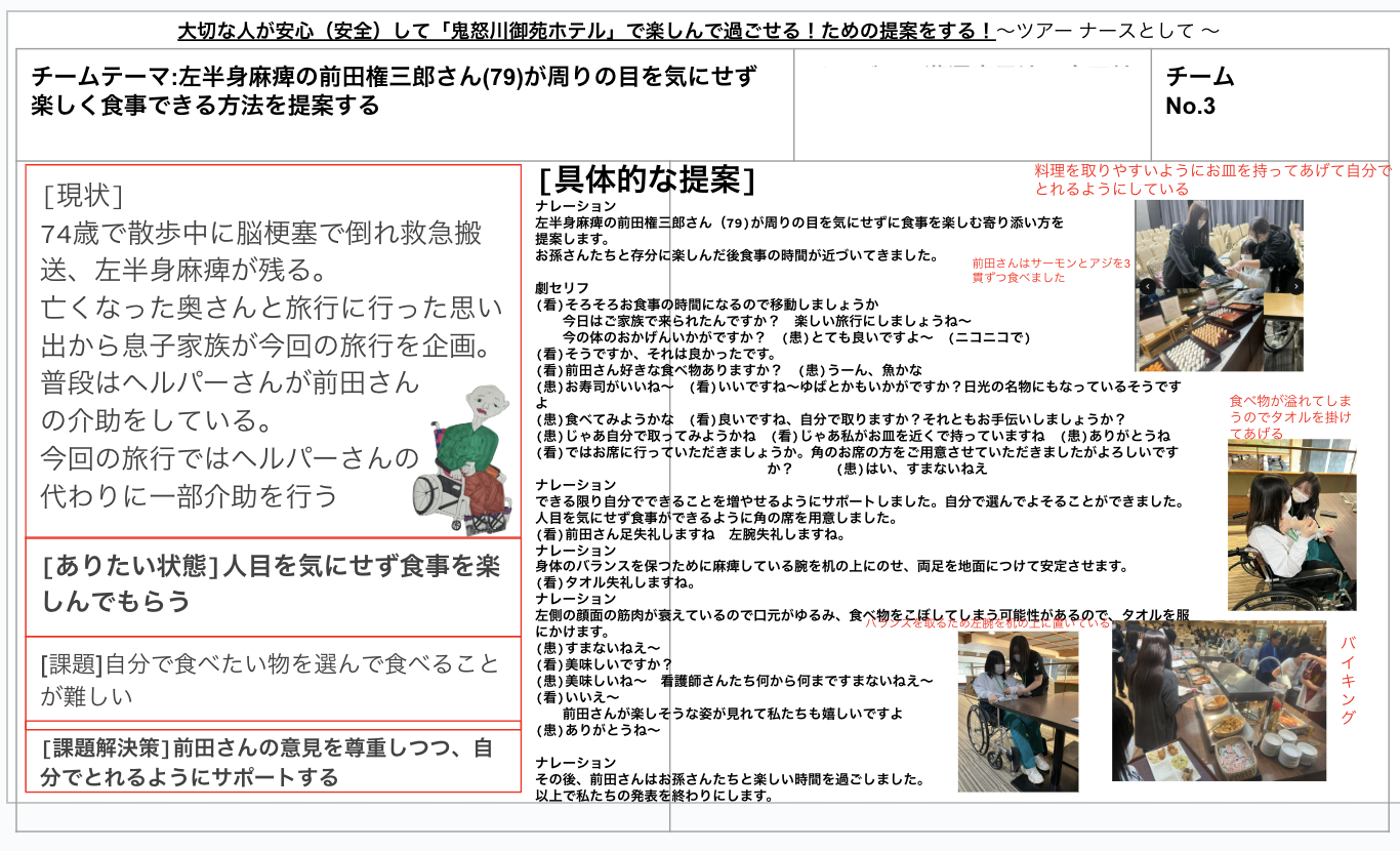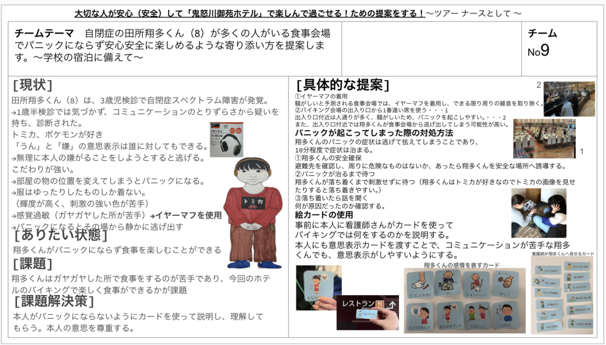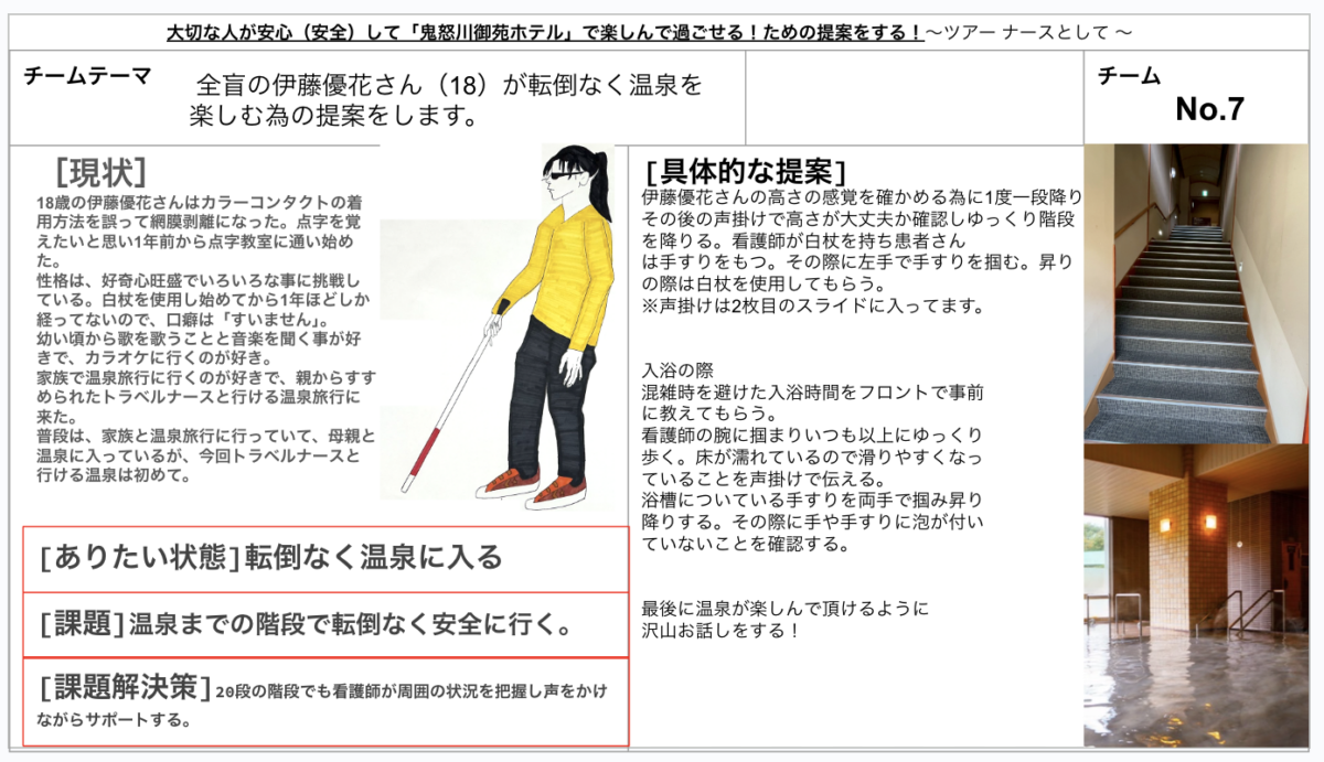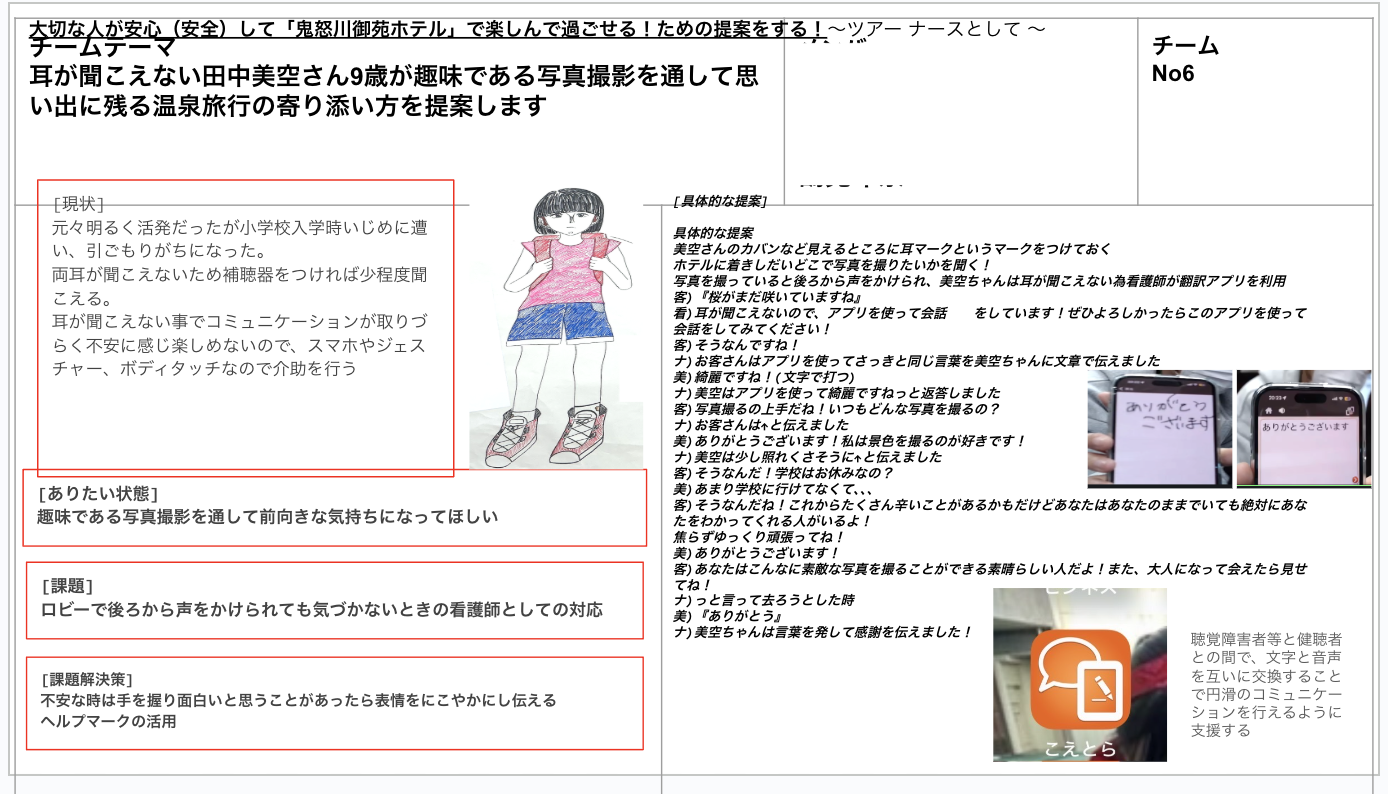 - 学生は「その方が安心して楽しめる方法」を構想し、ホテルの現場を調べ、支援の提案を行う。