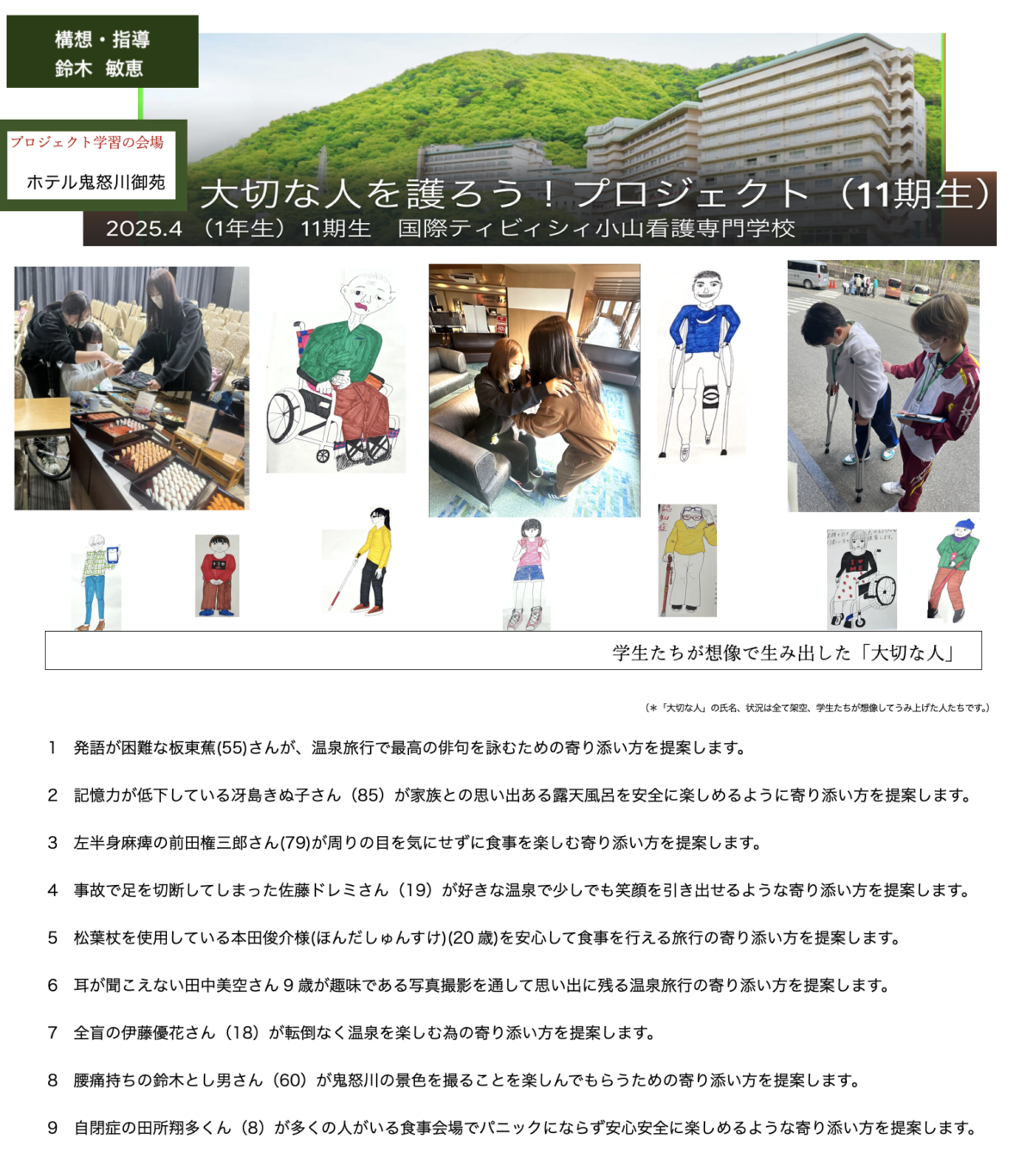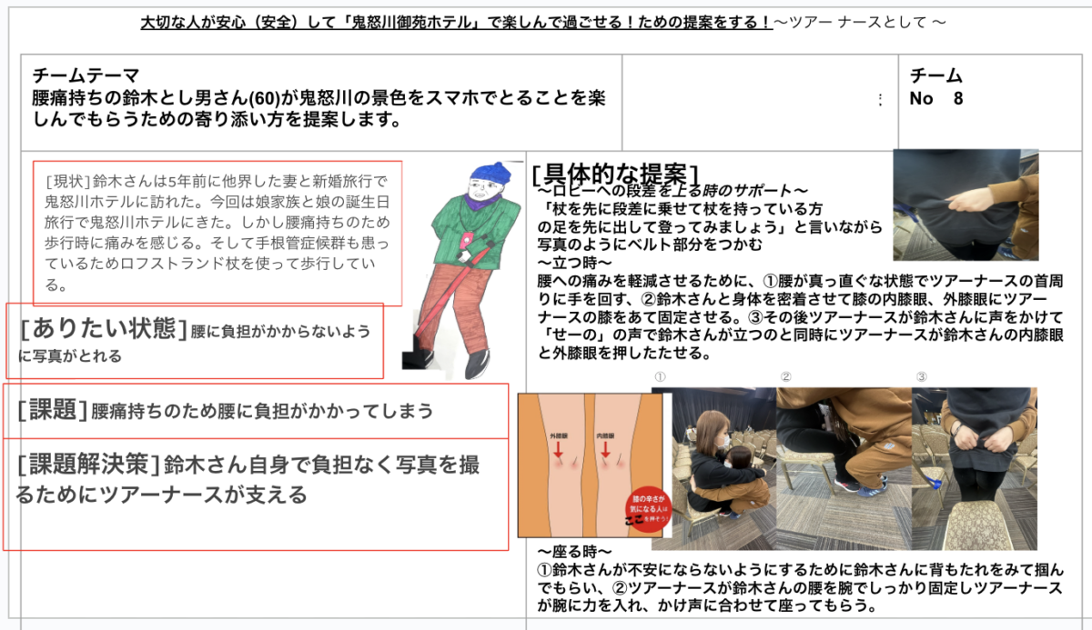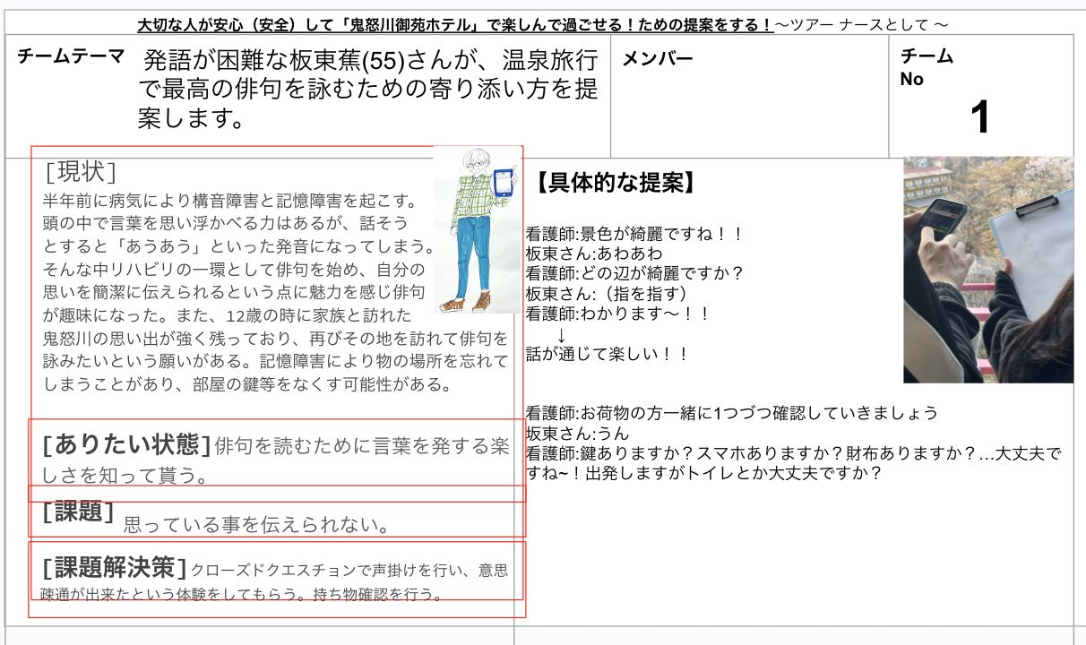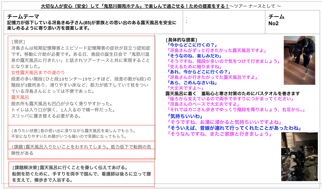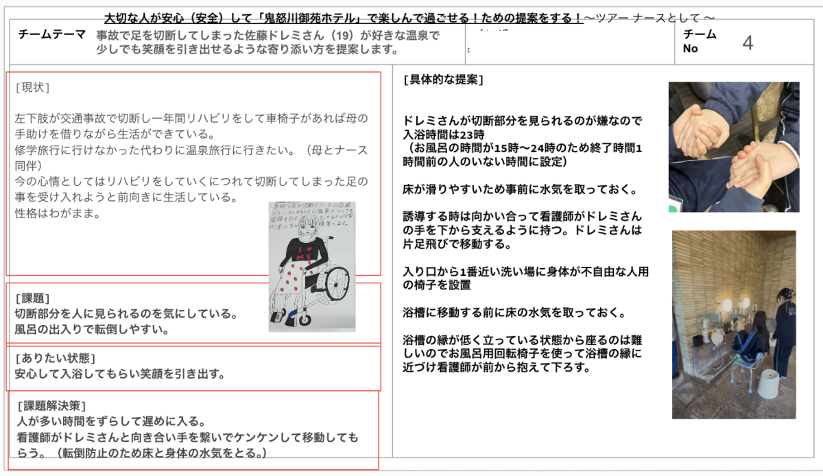 - 学生は「その方が安心して楽しめる方法」を構想し、ホテルの現場を調べ、支援の提案を行う。